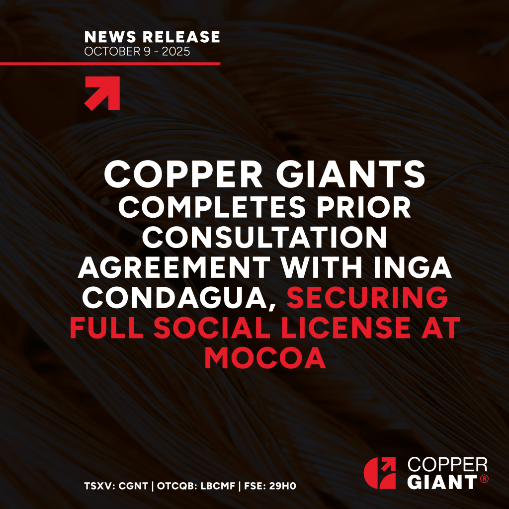 Vancouver, British Columbia – October 9, 2025 – Copper Giant Resources Corp. (“Copper Giant” or the “Company”) (TSXV: CGNT, OTCQB: LBCMF, FRA: 29H0) is pleased to announce the successful completion of the Prior Consultation (“Consulta Previa”) process with the Inga Condagua Indigenous Community (“Inga Condagua” or “Inga Condagua Nation”), coordinated by the National Directorate of Prior Consultation (DANCP) of the […]