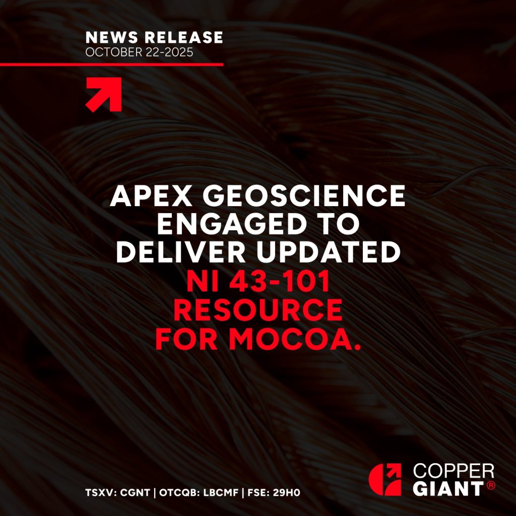 Vancouver, British Columbia – October 22, 2025 – Copper Giant Resources Corp. (“Copper Giant” or the “Company”) (TSXV: CGNT, OTCQB: LBCMF, FRA: 29H0) announces it has engaged APEX Geoscience Ltd., an independent geological consulting firm, to prepare an updated NI 43-101 Mineral Resource Estimate for the Company’s flagship Mocoa copper-molybdenum project in Putumayo, Colombia. The new estimate will incorporate […]