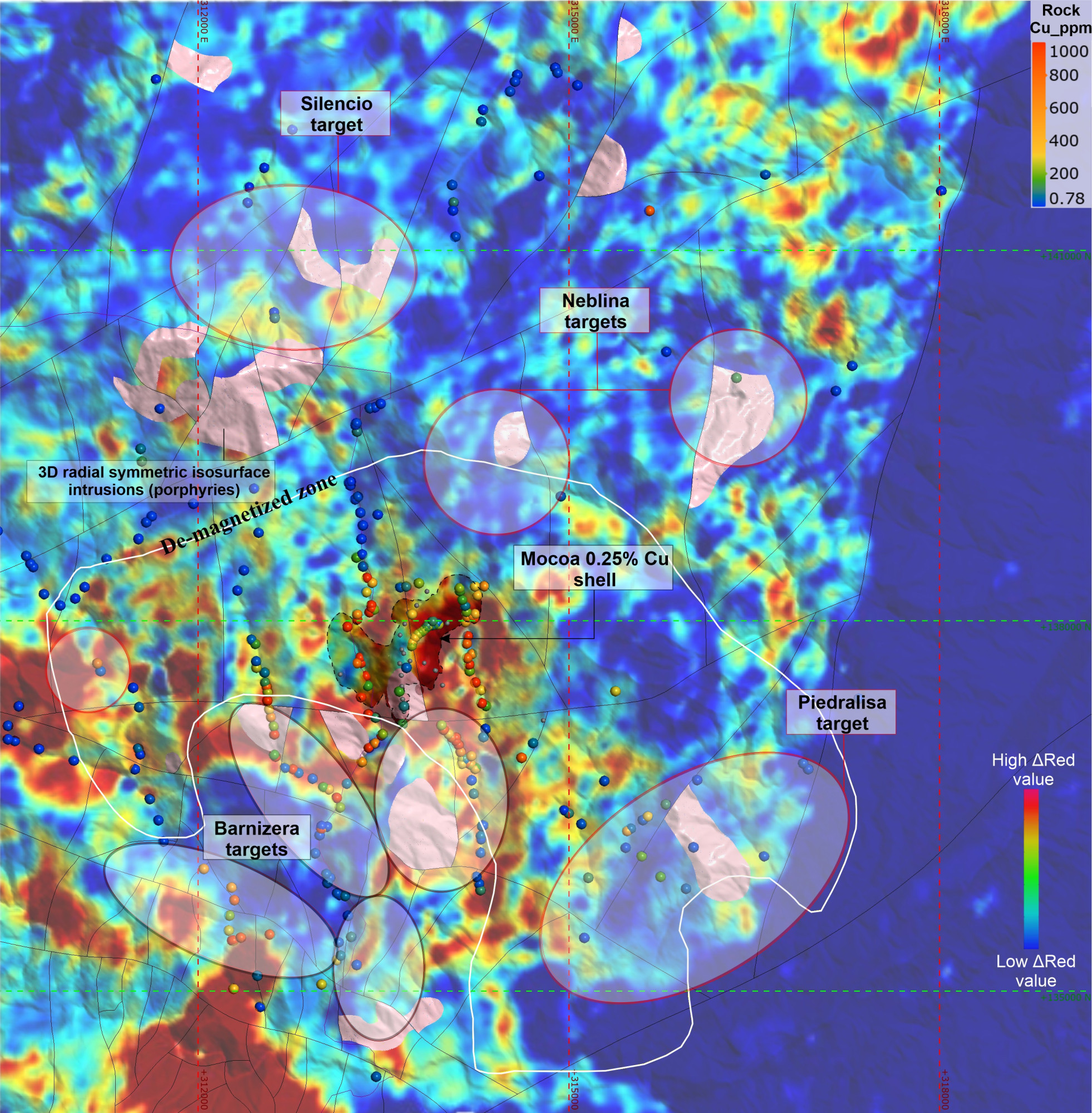 3) Located 2,500 meters southwest of the Mocoa deposit, associated with a buried 3D radial symmetric isosurface intrusion (porphyry) with highly elevated Cu-Mo+/-Zn in rock samples hosted by marble, with strong K-alteration. Possible extension to the SW of the skarn target (2) with underlying porphyry – possibly similar to Mocoa.