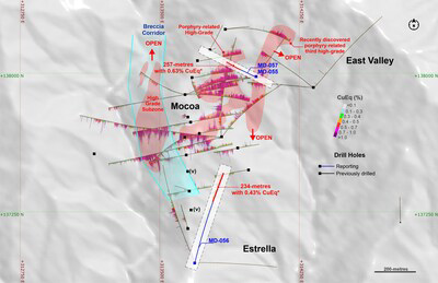 • Hole MD-056 intercepted higher copper and molybdenum grades at depth on the southern edge of the MRE footprint at Mocoa towards the La Estrella target (Figure 1) with 386 metres grading 0.39% CuEq* (0.20% Cu and 0.04% Mo) starting at 307m including last 77 metres of the hole with 0.49% CuEq* (0.33% Cu and 0.03% Mo) over a microdiorite porphyry phase potentially related to the recently discovered third high-grade zone at Mocoa.