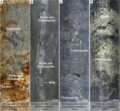 Figure 6. Mineralization and hydrothermal alteration observed in hole MD-057. A). Strong sericite altered microtonalite porphyry with quartz "eyes" texture, disseminated chalcocite and late chalcopyrite-pyrite veining. B). Strong sericite altered Intramineral porphyry with C-type veining (chalcopyrite dominant). C). Potassic altered Intramineral porphyry with molybdenite (Moly) disseminated and chalcopyrite veining. D). Strong sericite altered Intramineral porphyry with disseminated chalcopyrite and veining of molybdenite (Moly). (CNW Group/COPPER GIANT RESOURCES CORP.)