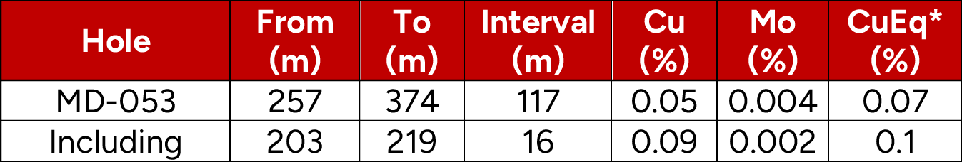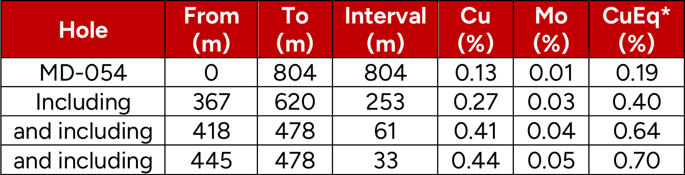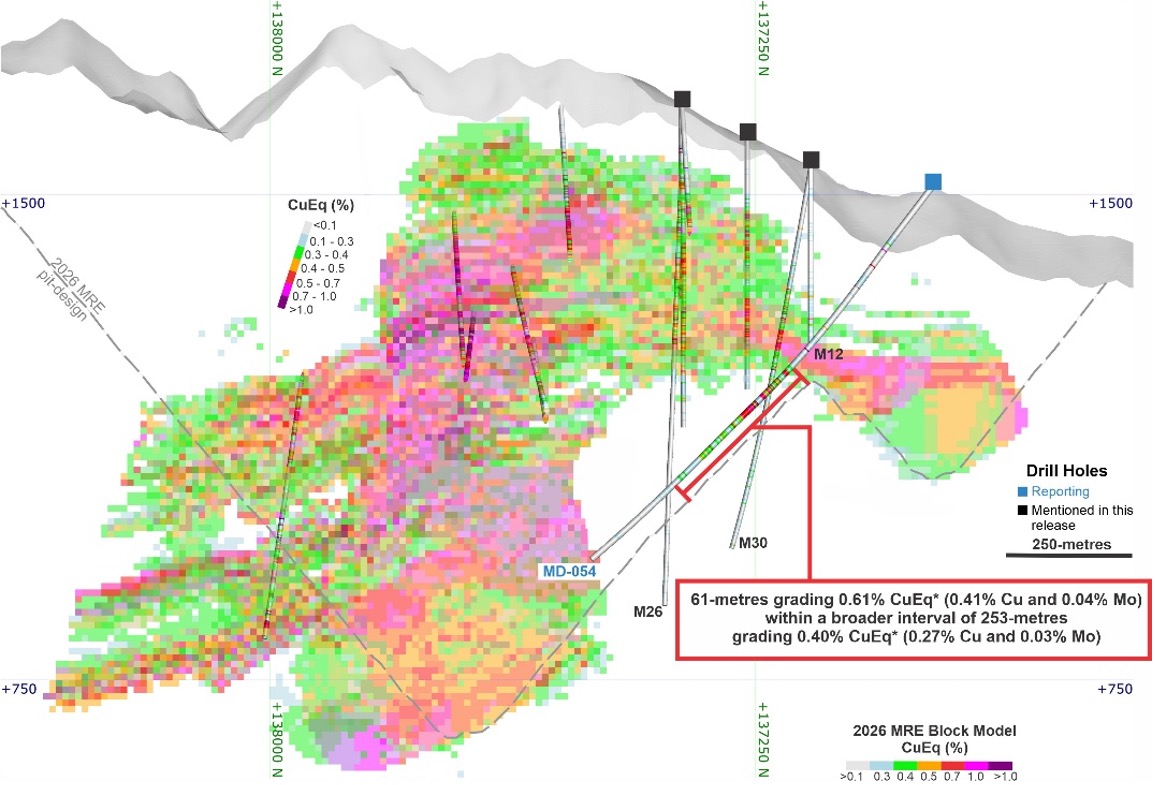·Hole MD-054 returned copper and molybdenum grades above the 2026 MRE¹ block model in an area previously modelled as waste due to sparse drilling by shallow, low-grade vertical holes (M12, M26 and M30), intercepting 61-metres grading 0.61% CuEq* (0.41% Cu and 0.04% Mo) within a broader interval of 253-metres grading 0.40% CuEq* (0.27% Cu and 0.03% Mo), starting at 367-metres downhole.