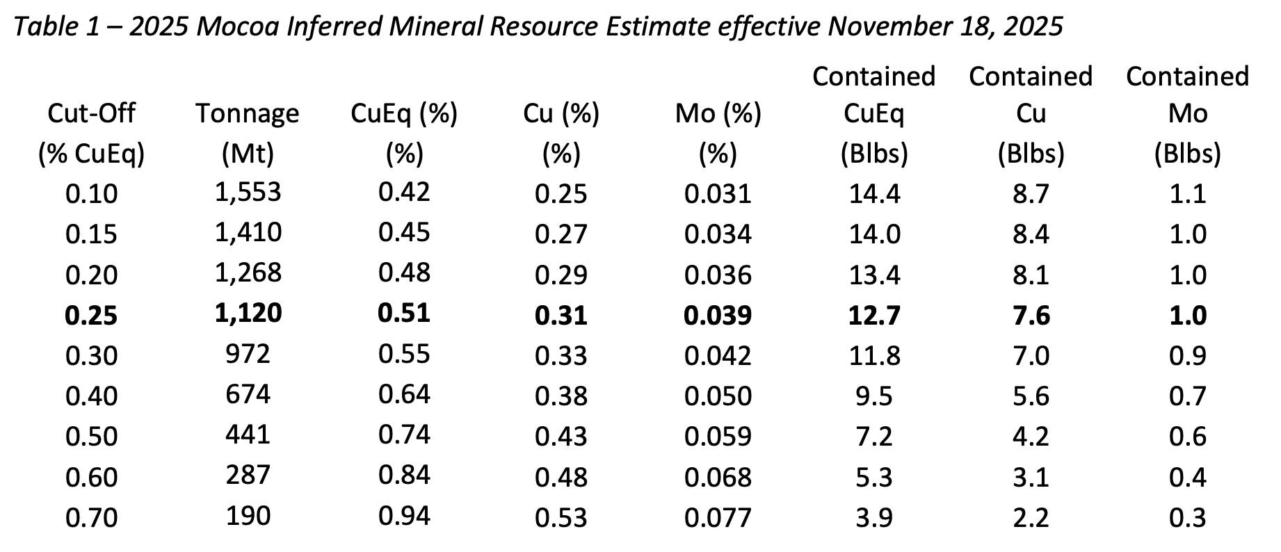 Table 1 – 2025 Mocoa Inferred Mineral Resource Estimate effective November 18, 2025