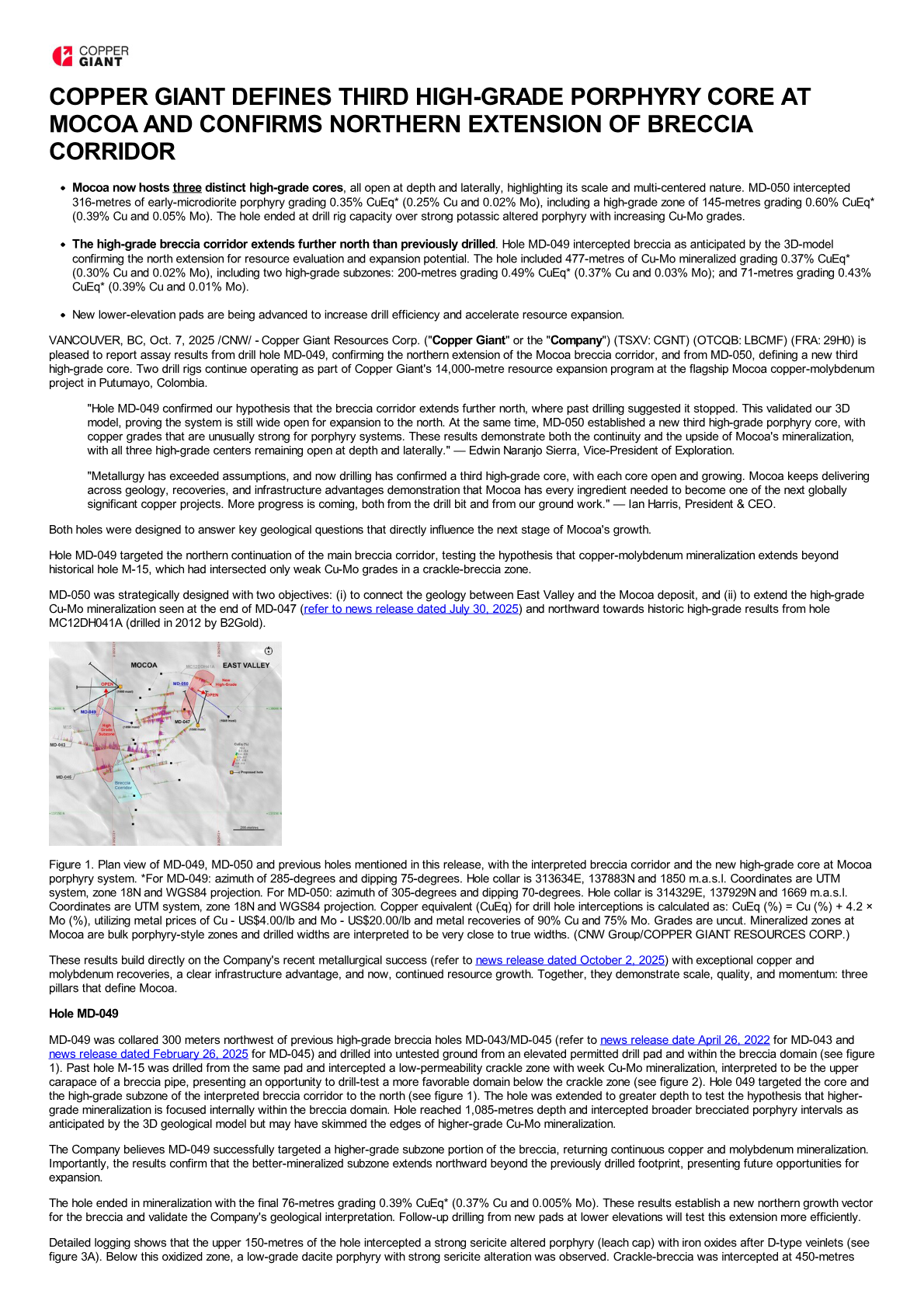 VANCOUVER, BC, Oct. 7, 2025 /CNW/ - Copper Giant Resources Corp. ("Copper Giant" or the "Company") (TSXV: CGNT) (OTCQB: LBCMF) (FRA: 29H0) is pleased to report assay results from drill hole MD-049, confirming the northern extension of the Mocoa breccia corridor, and from MD-050, defining a new third high-grade core. Two drill rigs continue operating as part of Copper Giant's 14,000-metre resource expansion program at the flagship Mocoa copper-molybdenum project in Putumayo, Colombia.