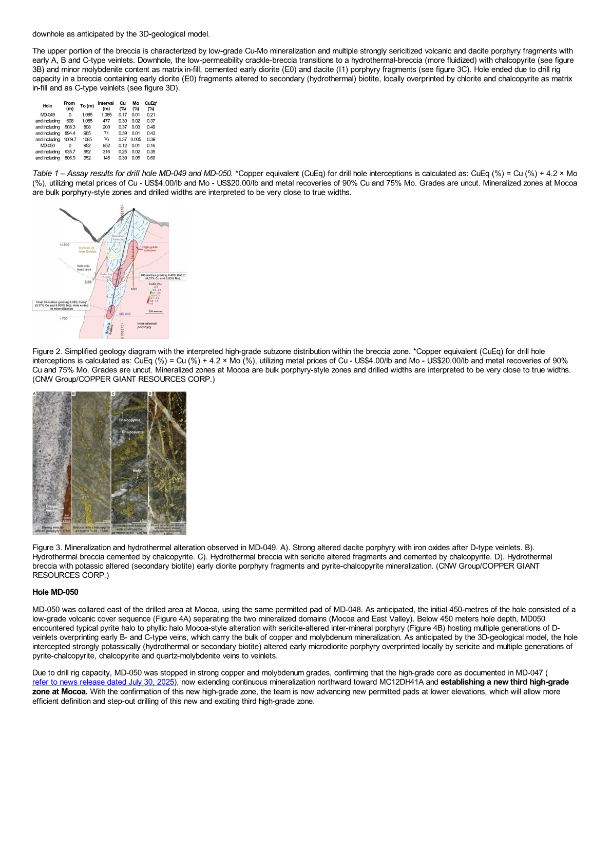 MD-050 was strategically designed with two objectives: (i) to connect the geology between East Valley and the Mocoa deposit, and (ii) to extend the high-grade Cu-Mo mineralization seen at the end of MD-047 (refer to news release dated July 30, 2025) and northward towards historic high-grade results from hole MC12DH041A (drilled in 2012 by B2Gold).