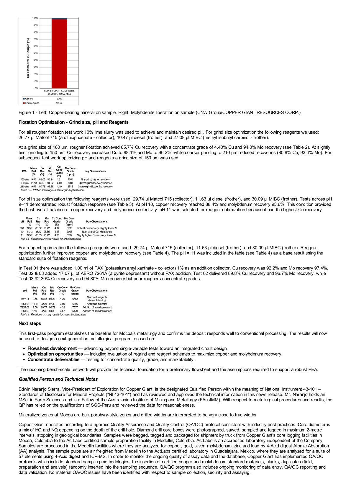 Edwin Naranjo Sierra, Vice-President of Exploration for Copper Giant, is the designated Qualified Person within the meaning of National Instrument 43-101 – Standards of Disclosure for Mineral Projects ("NI 43-101") and has reviewed and approved the technical information in this news release. Mr. Naranjo holds an MSc. in Earth Sciences and is a Fellow of the Australasian Institute of Mining and Metallurgy (FAusIMM). With respect to metallurgical procedures and results, the QP has relied on the qualifications of SGS-Peru and reviewed the data for reasonableness.