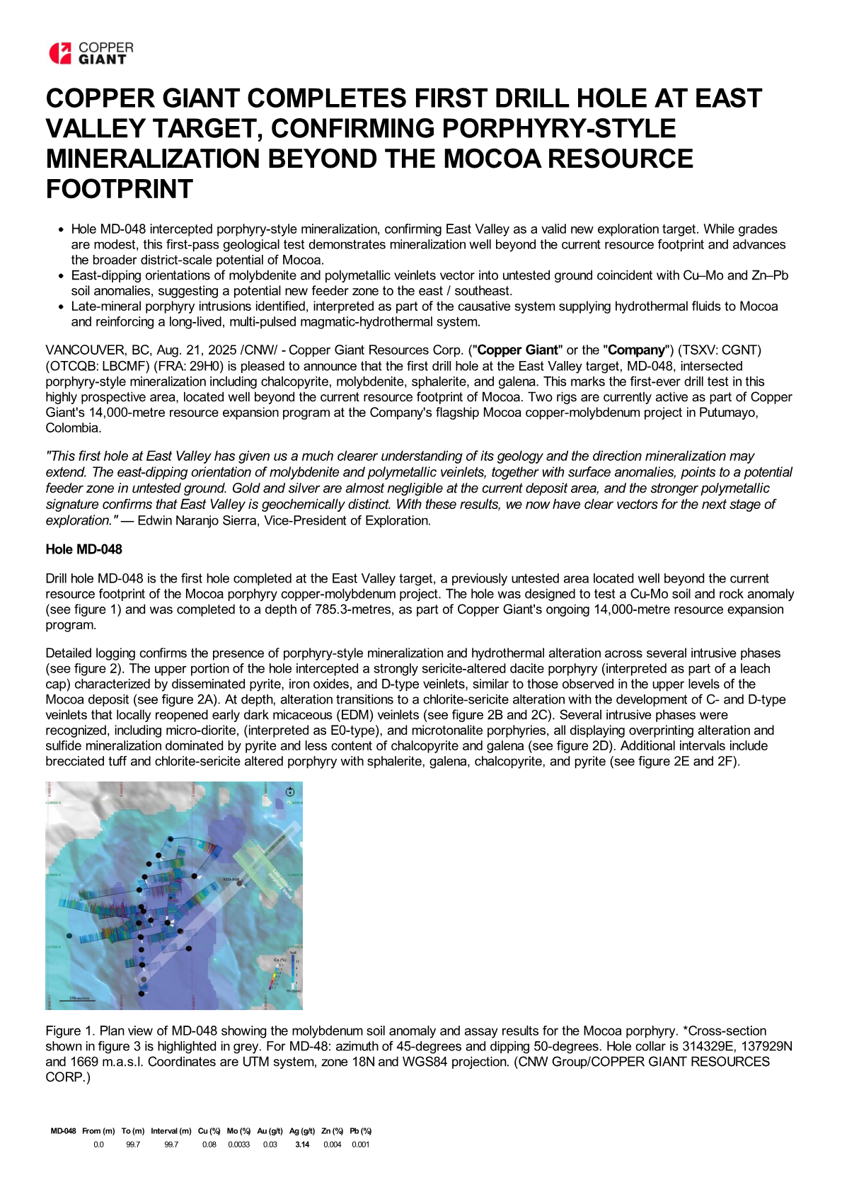 VANCOUVER, BC, Aug. 21, 2025 /CNW/ - Copper Giant Resources Corp. ("Copper Giant" or the "Company") (TSXV: CGNT) (OTCQB: LBCMF) (FRA: 29H0) is pleased to announce that the first drill hole at the East Valley target, MD-048, intersected porphyry-style mineralization including chalcopyrite, molybdenite, sphalerite, and galena. This marks the first-ever drill test in this highly prospective area, located well beyond the current resource footprint of Mocoa. Two rigs are currently active as part of Copper Giant's 14,000-metre resource expansion program at the Company's flagship Mocoa copper-molybdenum project in Putumayo, Colombia.