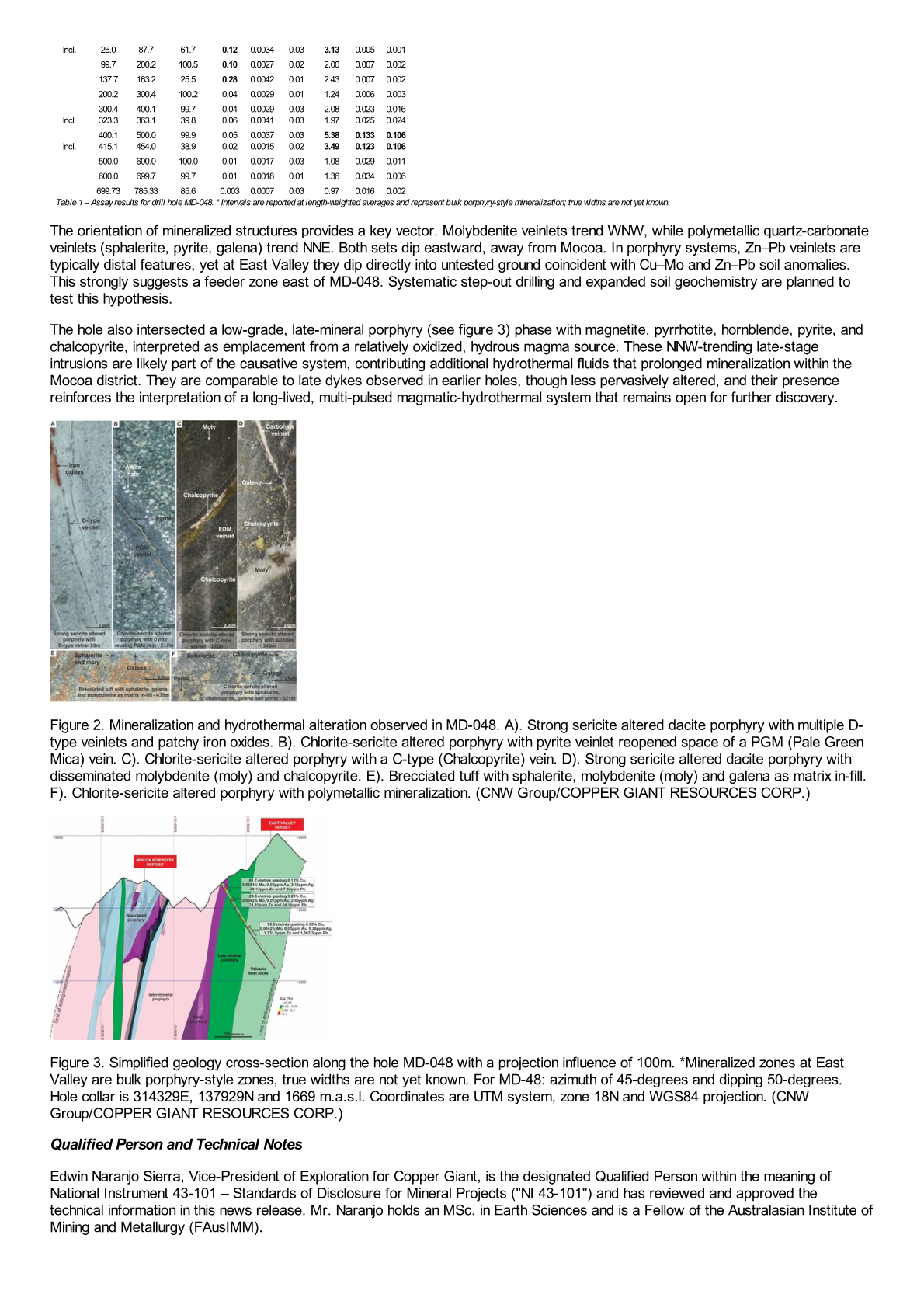 Drill hole MD-048 is the first hole completed at the East Valley target, a previously untested area located well beyond the current resource footprint of the Mocoa porphyry copper-molybdenum project. The hole was designed to test a Cu-Mo soil and rock anomaly (see figure 1) and was completed to a depth of 785.3-metres, as part of Copper Giant's ongoing 14,000-metre resource expansion program.