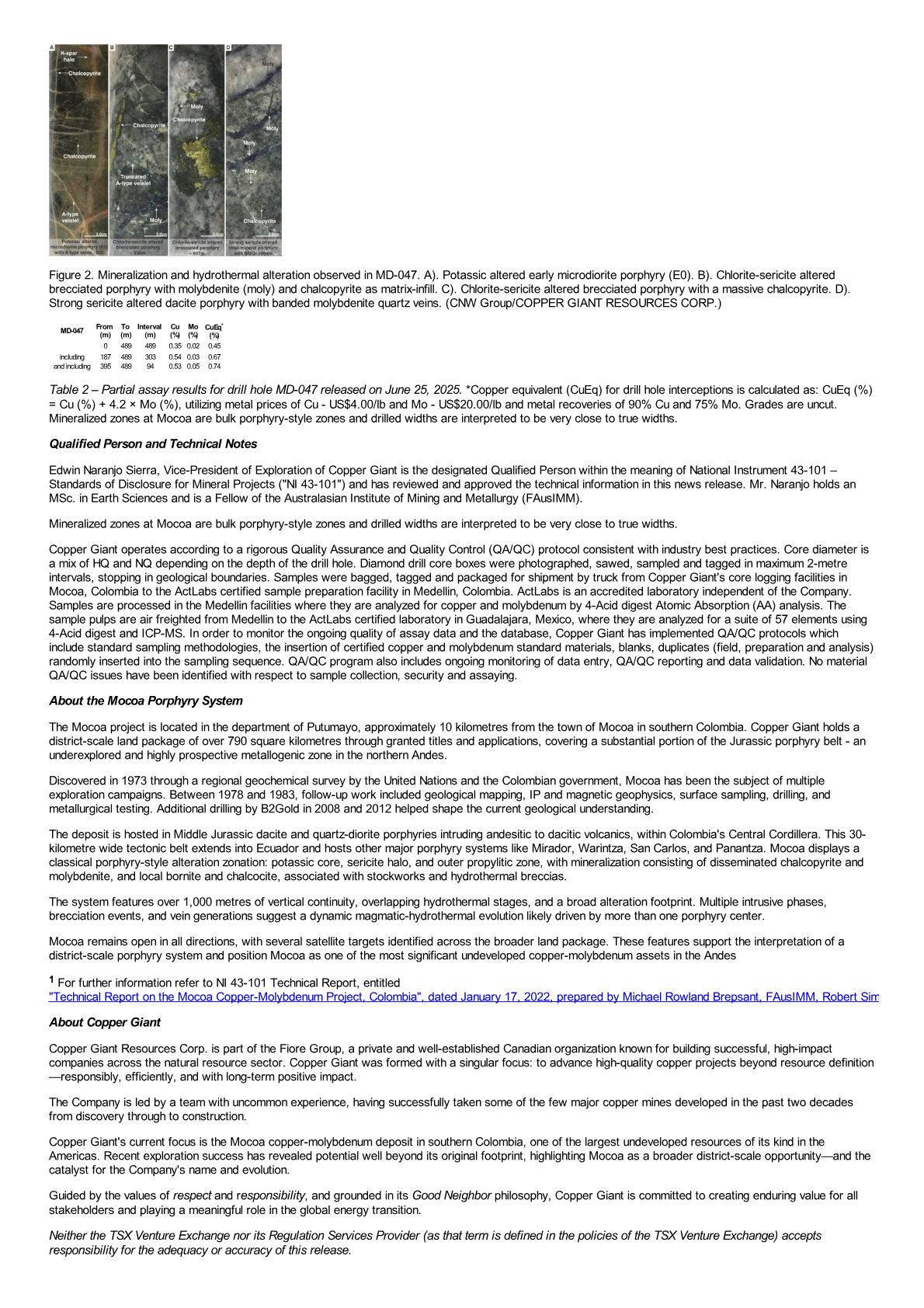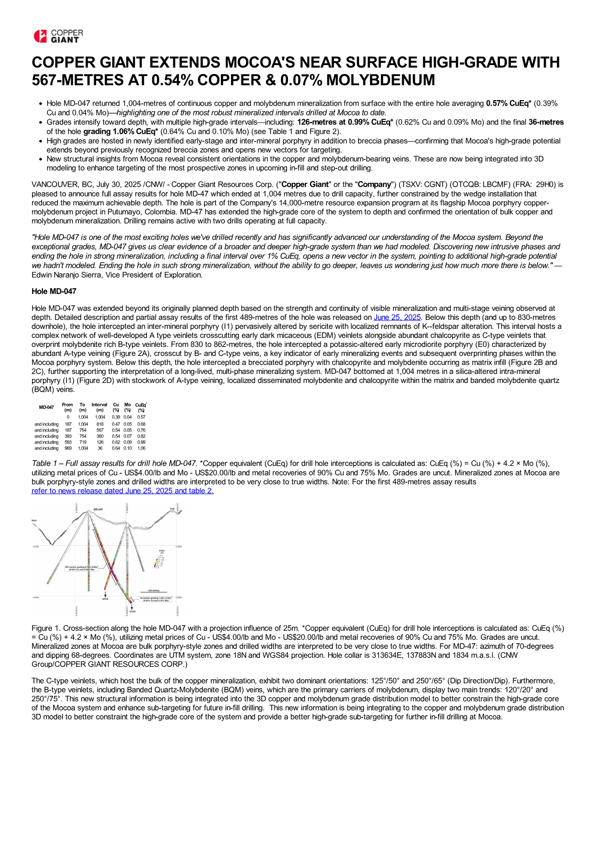 VANCOUVER, BC, July 30, 2025 /CNW/ - Copper Giant Resources Corp. ("Copper Giant" or the "Company") (TSXV: CGNT) (OTCQB: LBCMF) (FRA: 29H0) is pleased to announce full assay results for hole MD-47 which ended at 1,004 metres due to drill capacity, further constrained by the wedge installation that reduced the maximum achievable depth. The hole is part of the Company's 14,000-metre resource expansion program at its flagship Mocoa porphyry copper-molybdenum project in Putumayo, Colombia. MD-47 has extended the high-grade core of the system to depth and confirmed the orientation of bulk copper and molybdenum mineralization. Drilling remains active with two drills operating at full capacity.