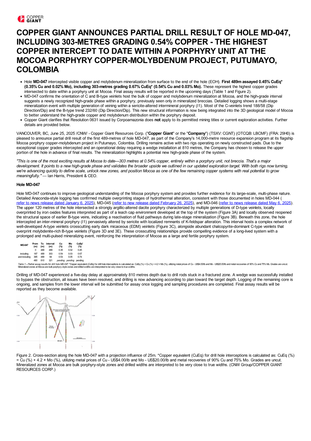 VANCOUVER, BC, June 25, 2025 /CNW/ - Copper Giant Resources Corp. ("Copper Giant" or the "Company") (TSXV: CGNT) (OTCQB: LBCMF) (FRA: 29H0) is pleased to announce partial drill result of the first 489-metres of hole MD-047, as part of the Company's 14,000-metre resource expansion program at its flagship Mocoa porphyry copper-molybdenum project in Putumayo, Colombia. Drilling remains active with two rigs operating on newly constructed pads. Due to the exceptional copper grades intercepted and an operational delay requiring a wedge installation at 810 metres, the Company has chosen to release the upper portion of the hole in advance of final results. The mineralization highlights a potential new high-grade phase of the system.