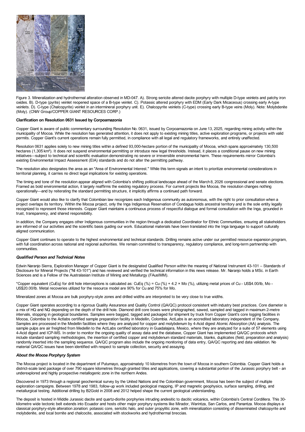 Copper Giant is aware of public commentary surrounding Resolution No. 0631, issued by Corpoamazonia on June 13, 2025, regarding mining activity within the municipality of Mocoa. While the resolution has generated attention, it does not apply to existing mining titles, active exploration programs, or projects with valid permits. Copper Giant's current operations remain fully permitted, in compliance with all legal and regulatory frameworks, and entirely unaffected.