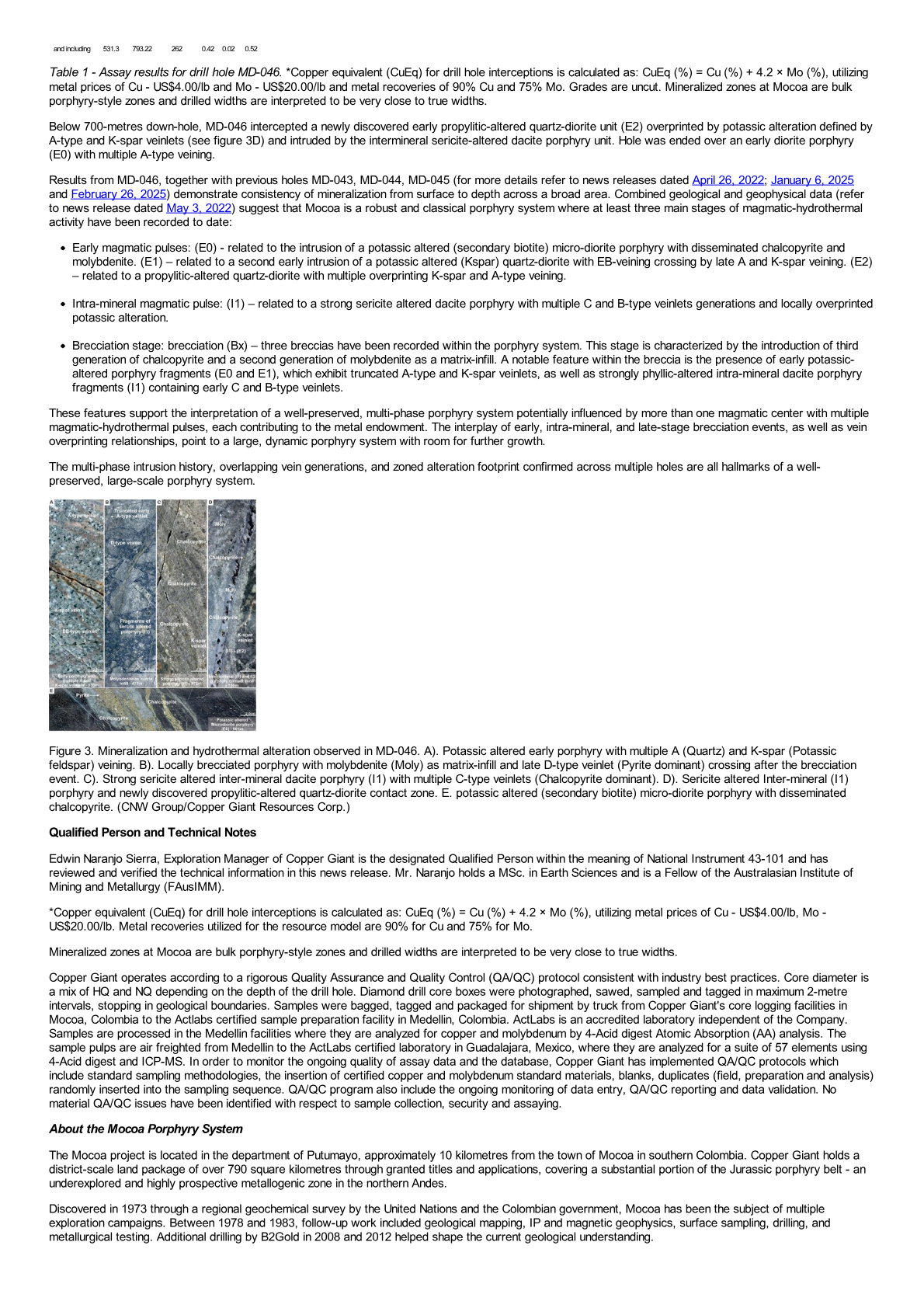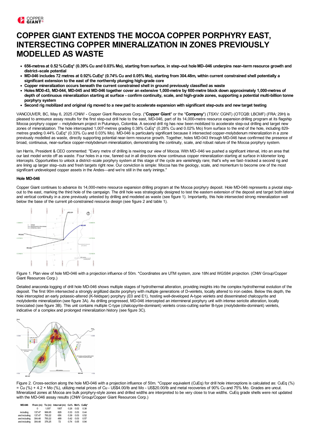 VANCOUVER, BC, May 6, 2025 /CNW/ - Copper Giant Resources Corp. ("Copper Giant" or the "Company") (TSXV: CGNT) (OTCQB: LBCMF) (FRA: 29H) is pleased to announce assay results for the first step-out drill hole to the east, MD-046, part of its 14,000-metre resource expansion drilling program at its flagship Mocoa porphyry copper – molybdenum project in Putumayo, Colombia. A second drill rig has now been mobilized to accelerate step-out drilling and target new zones of mineralization. The hole intercepted 1,007-metres grading 0.38% CuEq* (0.28% Cu and 0.02% Mo) from surface to the end of the hole, including 829- metres grading 0.44% CuEq* (0.33% Cu and 0.03% Mo). MD-046 is particularly significant because it intersected copper-molybdenum mineralization in a zone previously modelled as waste, directly supporting potential near-term resource growth. Together, holes MD-043 through MD-046 have confirmed the presence of broad, continuous, near-surface copper-molybdenum mineralization, demonstrating the continuity, scale, and robust nature of the Mocoa porphyry system.