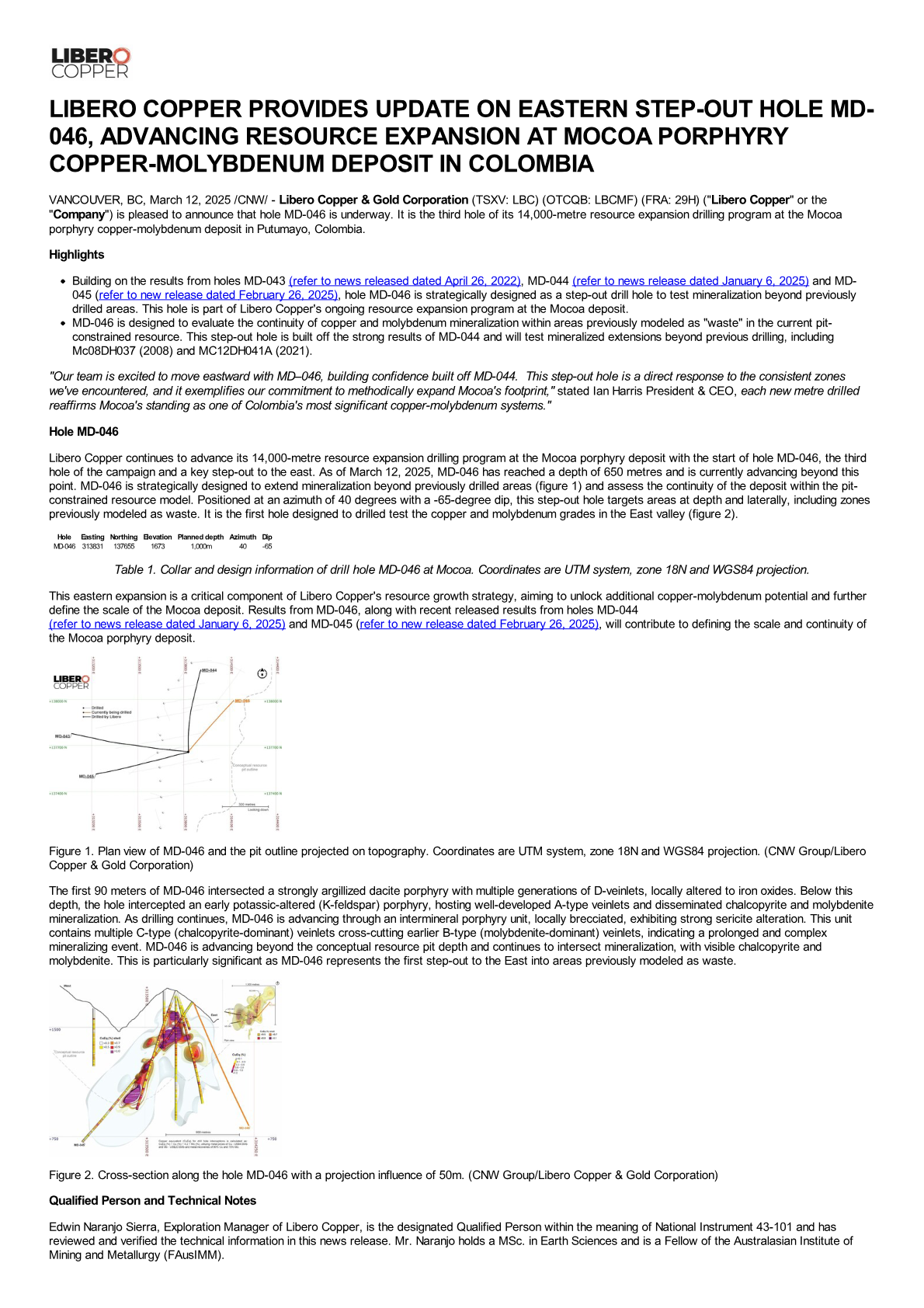 Building on the results from holes MD-043 (refer to news released dated April 26, 2022), MD-044 (refer to news release dated January 6, 2025) and MD-045 (refer to new release dated February 26, 2025), hole MD-046 is strategically designed as a step-out drill hole to test mineralization beyond previously drilled areas. This hole is part of Libero Copper's ongoing resource expansion program at the Mocoa deposit.