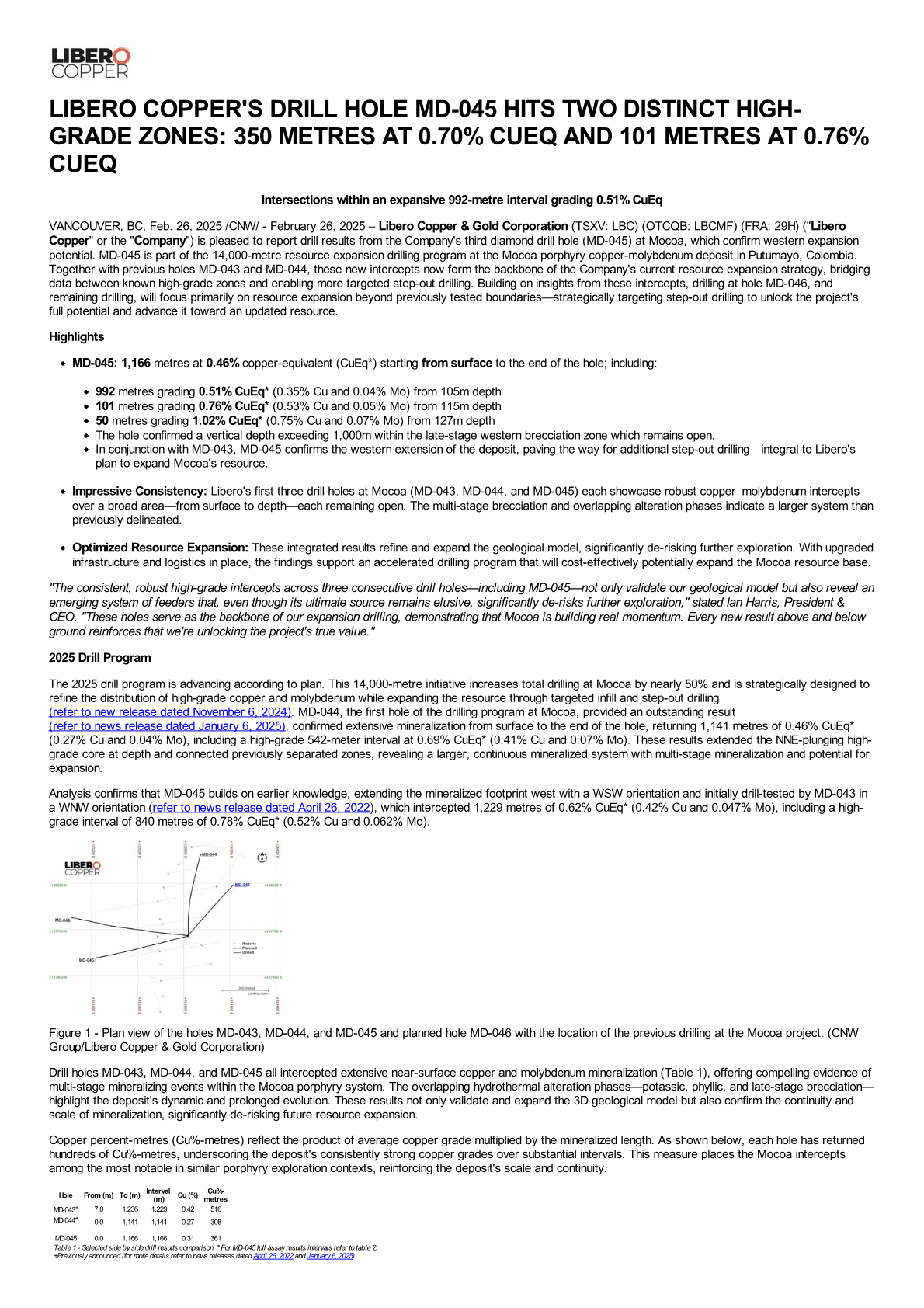 VANCOUVER, BC, Feb. 26, 2025 /CNW/ - February 26, 2025 – Libero Copper & Gold Corporation (TSXV: LBC) (OTCQB: LBCMF) (FRA: 29H) ("Libero Copper" or the "Company") is pleased to report drill results from the Company's third diamond drill hole (MD-045) at Mocoa, which confirm western expansion potential. MD-045 is part of the 14,000-metre resource expansion drilling program at the Mocoa porphyry copper-molybdenum deposit in Putumayo, Colombia. Together with previous holes MD-043 and MD-044, these new intercepts now form the backbone of the Company's current resource expansion strategy, bridging data between known high-grade zones and enabling more targeted step-out drilling. Building on insights from these intercepts, drilling at hole MD-046, and remaining drilling, will focus primarily on resource expansion beyond previously tested boundaries—strategically targeting step-out drilling to unlock the project's full potential and advance it toward an updated resource.