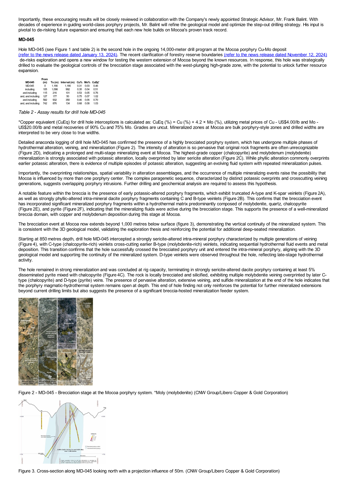 Hole MD-045 (see Figure 1 and table 2) is the second hole in the ongoing 14,000-meter drill program at the Mocoa porphyry Cu-Mo deposit (refer to the news release dated January 13, 2024). The recent clarification of forestry reserve boundaries (refer to the news release dated November 12, 2024) de-risks exploration and opens a new window for testing the western extension of Mocoa beyond the known resources. In response, this hole was strategically drilled to evaluate the geological controls of the brecciation stage associated with the west-plunging high-grade zone, with the potential to unlock further resource expansion.