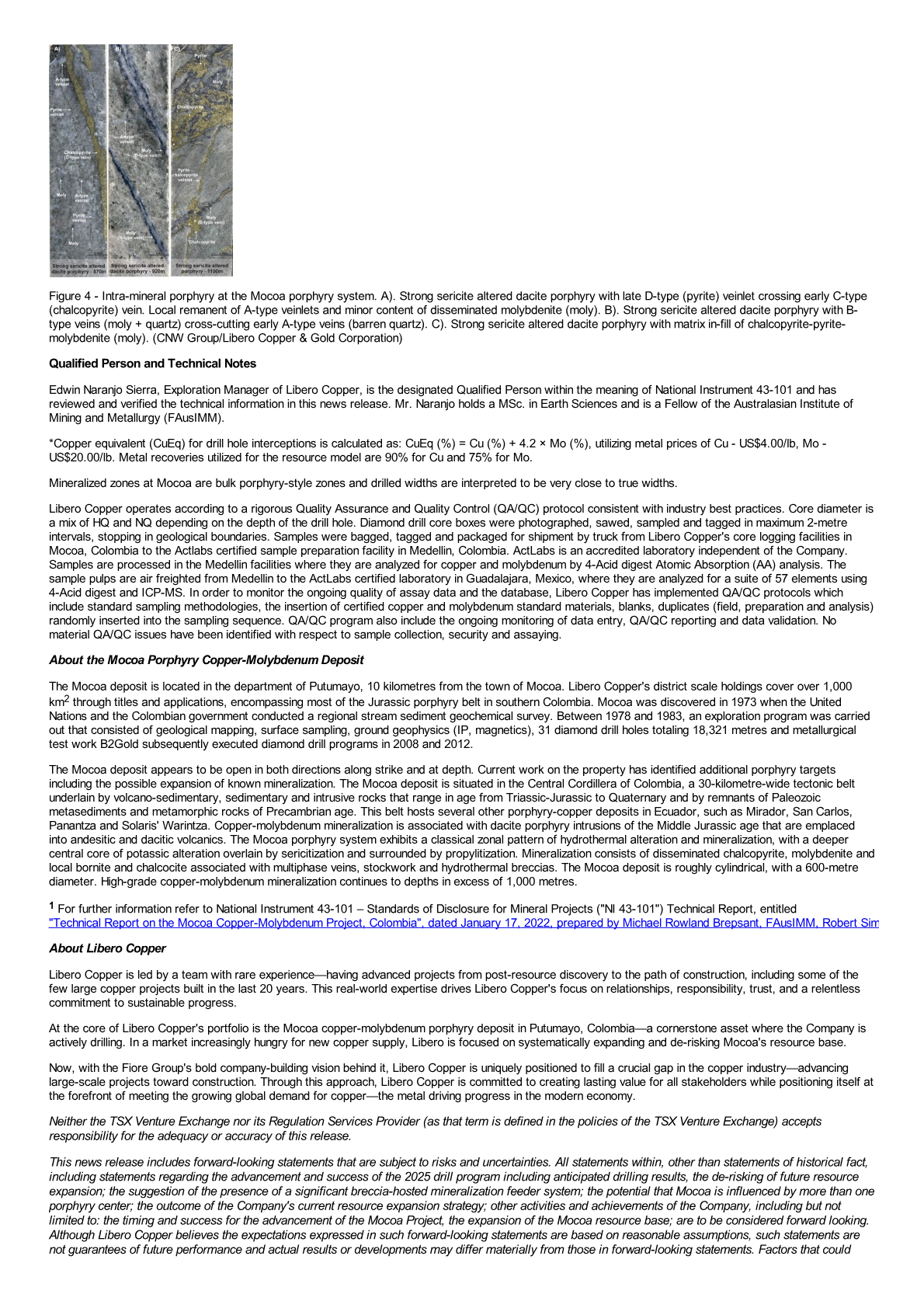 This news release includes forward-looking statements that are subject to risks and uncertainties. All statements within, other than statements of historical fact, including statements regarding the advancement and success of the 2025 drill program including anticipated drilling results, the de-risking of future resource expansion; the suggestion of the presence of a significant breccia-hosted mineralization feeder system; the potential that Mocoa is influenced by more than one porphyry center; the outcome of the Company's current resource expansion strategy; other activities and achievements of the Company, including but not limited to: the timing and success for the advancement of the Mocoa Project, the expansion of the Mocoa resource base; are to be considered forward looking. Although Libero Copper believes the expectations expressed in such forward-looking statements are based on reasonable assumptions, such statements are not guarantees of future performance and actual results or developments may differ materially from those in forward-looking statements. Factors that could cause actual results to differ materially from those in forward-looking statements include market prices and volatility with the Company's common shares, exploitation and exploration successes, uncertainty of reserve and resource estimates, risks of not achieving production, continued availability of capital and financing, processes, permits and filing requirements, risks related to operations in foreign and developing countries and compliance with foreign laws and including risks related to changes in foreign laws and changing policies related to mining and local ownership requirements in Colombia, and general economic, market, political or business conditions and regulatory and administrative approvals. There can be no assurances that such statements will prove accurate and, therefore, readers are advised to rely on their own evaluation of such uncertainties. We do not assume any obligation to update any forward-looking statements