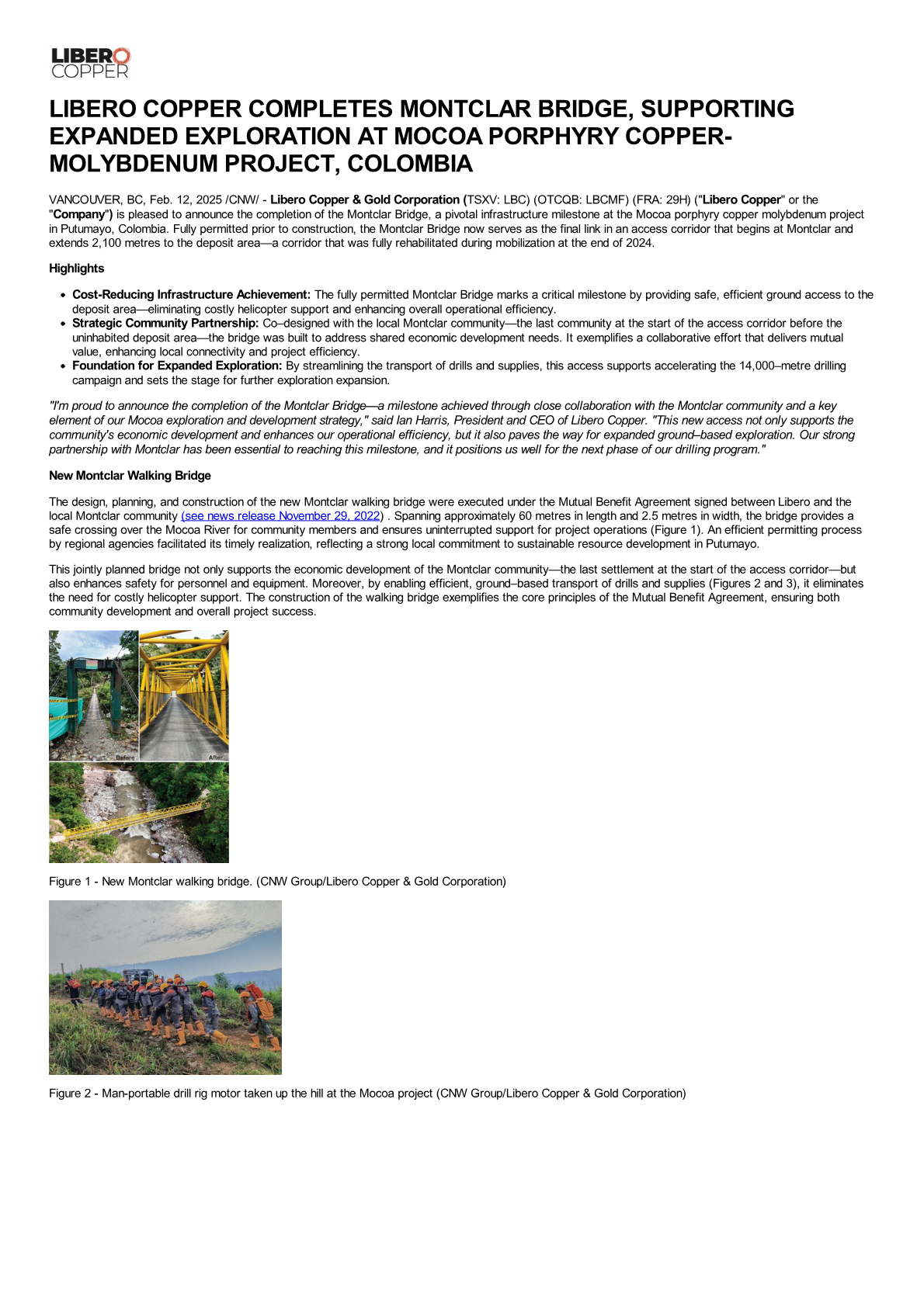 VANCOUVER, BC, Feb. 12, 2025 /CNW/ - Libero Copper & Gold Corporation (TSXV: LBC) (OTCQB: LBCMF) (FRA: 29H) ("Libero Copper" or the "Company") is pleased to announce the completion of the Montclar Bridge, a pivotal infrastructure milestone at the Mocoa porphyry copper-molybdenum project in Putumayo, Colombia. Fully permitted prior to construction, the Montclar Bridge now serves as the final link in an access corridor that begins at Montclar and extends 2,100 metres to the deposit area—a corridor that was fully rehabilitated during mobilization at the end of 2024.